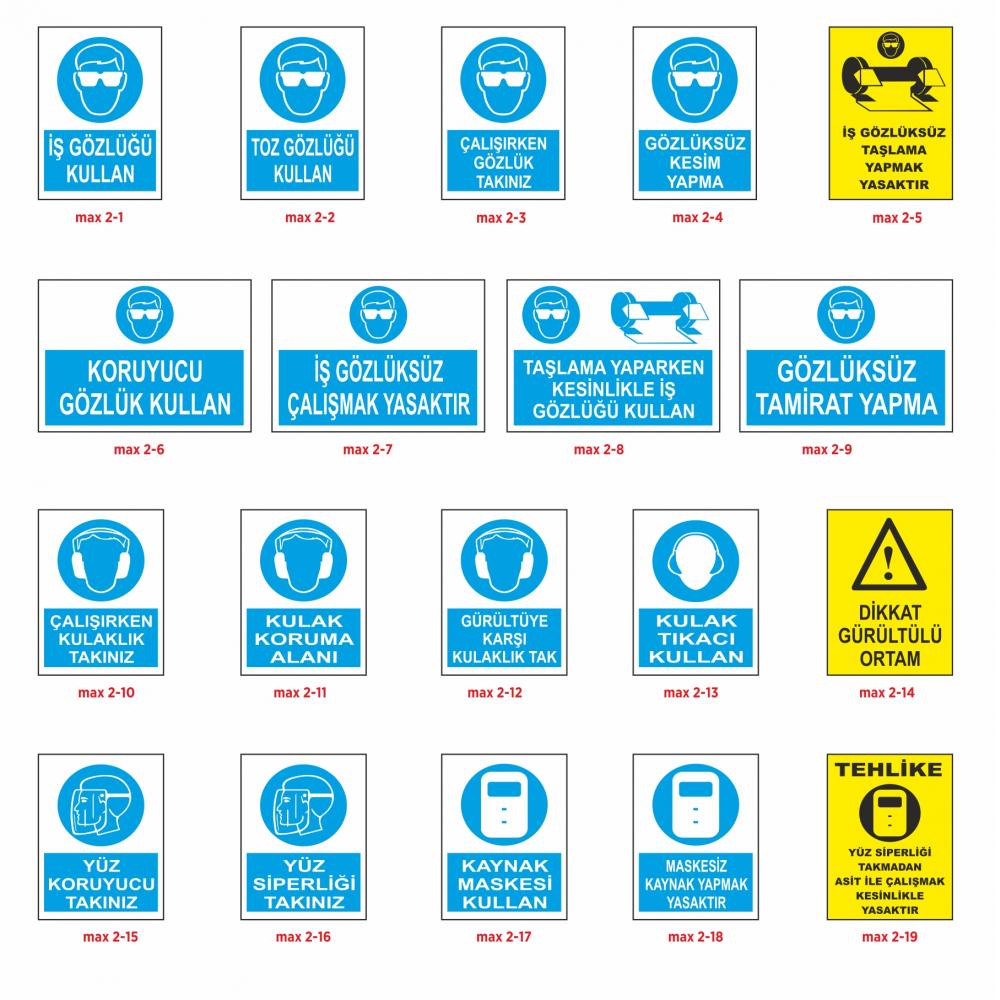 Fabrika çevre ve tesislerin güvenliğinde iş güvenliği levhaları genellikle 25 X 35 cm, 35 X 50 cm ve 50 X 70 cm ebatlarındadır.